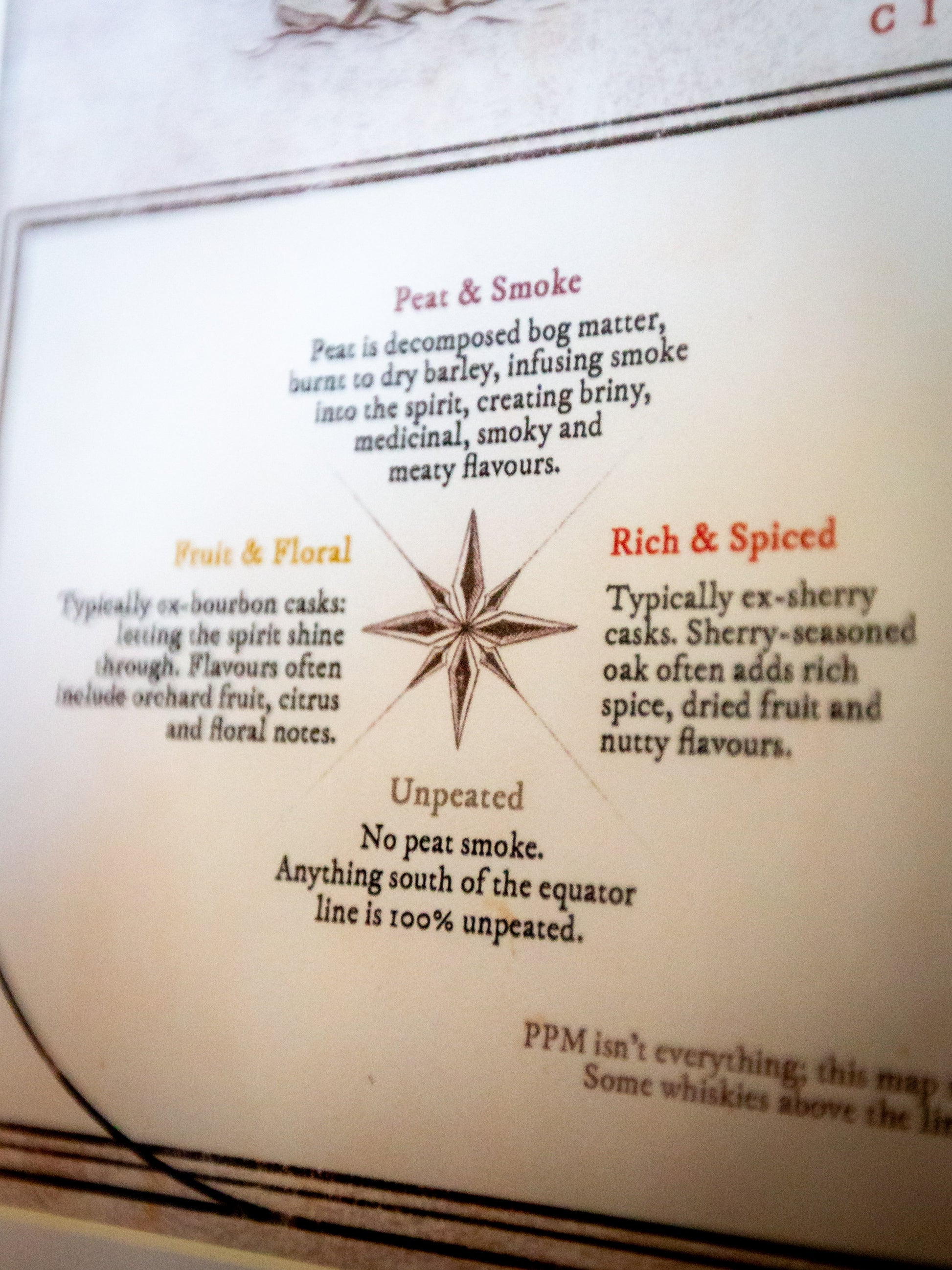 ✓ Compass directions for peat, smoke, fruit, floral, rich, and spiced characteristics