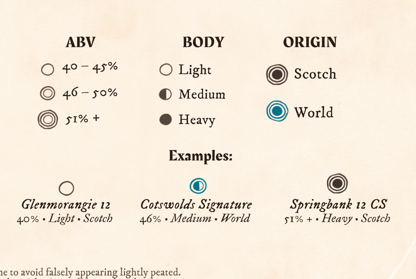 Everything in between is a complete spectrum. Lightly peated whiskies, balanced cask influence, funky Campbeltown styles, they're all positioned exactly where they sit flavour-wise.
